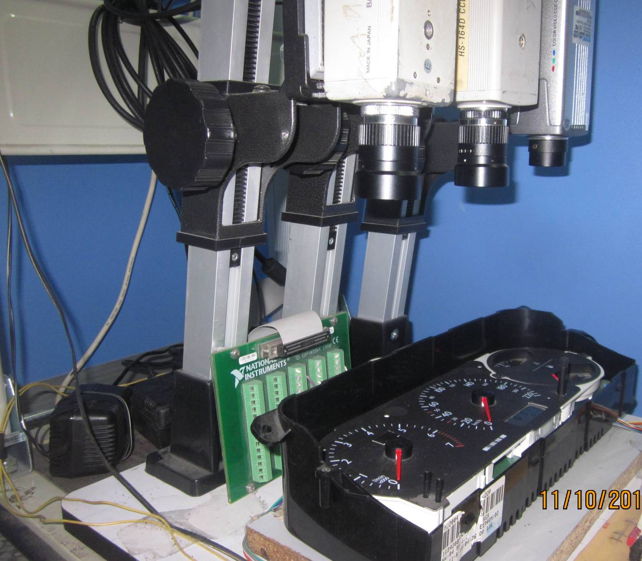 仪表板是汽车内饰件中最重要的组成单元,它集合了各种仪表、信号及操作开关,是汽车的操纵控制与显示的集中部位。仪表板出厂前须进行一次质量终检。检测项目包括:检测各表的指针与所有目标刻度间的指示误差;检测所有信号报警灯和若干照明灯是否损坏或漏装。目前在国内仪表板生产线广泛采用人工观测的方法,来判断产品质量是否合格。这种方法受人的主观因素如检验者观测角度、观测距离及疲劳程度等影响,误差大,可靠性差且效率低下。本系统采用机器视觉检测的技术,能够解决仪表板生产过程中质量检测的非自动化性以及人工检测带来的低效问题,可以提高仪表板的检测精度和自动化水平,保证产品质量,解决生产实际问题。主要技术指标:(1)指针仪表检测精度:0.5%;(2)检测时间:90秒;(3)误报率小于0.1%。