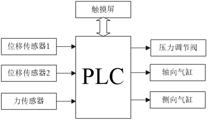一、试验台总体描述1、各工位配有配电柜及触摸控制屏,电气控制部分采用欧姆龙PLC,气动元件均采用亚德客品牌;2、操作高度为1000mm,台面高度为850mm;3、设备框架采用方钢管焊接结构,充分保证设备运行的稳定性;4、所有的钢件进行防腐处理;5、各工位均可自动、手动操作;6、所有位移变形量均采用位移传感器进行检测,扭转角度采用扭矩传感器检测,结果通过触摸屏显示。7、气缸输出力采用力传感器检测,调节阀调节,显示屏显示.二、转向盘静态系统原理1、检测内容本系统用于对转向盘的轴向整体静态加载性能试验(按QC/T563中2.3规定)和切向扭转加载试验(按QC/T563中规定)。试验分二个工位实现检测,左侧工位实现轴向整体静态加载性能试验,右侧工位实现切向扭转加载试验。2、检测原理系统以PLC为核心,将转向盘固定后,通过气压调节阀调节气压,结合力传感器所测定的力值,以准确固定试验所需加载力。利用气缸对转向盘进行轴向和切向加载, PLC按照检测要求读取相应的位移传感器和扭矩传感器数据,以测量转向盘轴向变形量、水平变形量和扭转变形角,检测结果送触摸屏显示,系统电气原理框图如图1所示。图1 转向盘轴向整体加载、切向扭转试验系统原理框图三、转向盘动态检测系统原理1、检测内容本系统用于对转向盘的轴向一点静态加载性能(按QC/T563中2.3规定)进行检测和轴向及扭转动态疲劳耐久进行试验(按Q/FTA026-2004中规定)。2、检测原理系统采用PLC控制,待测转向盘固定后,通过气缸对转向盘进行轴向和切向方向加载,测试转向盘的轴向变形位移;固定转向盘,通过气缸对转向盘进行轴向和切向方向加载,按设定的加载频率和加载力进行考核转向盘的疲劳耐久寿命,系统电气原理框图如图2所示。图2 转向盘轴向单点加载、动态耐久试验系统原理框图四、设备主要技术参数①气压:5bar以上②测力精度:±25N③位移精度:±0.35mm④力矩控制精度:±15Nm⑤角度精度:±0.4°