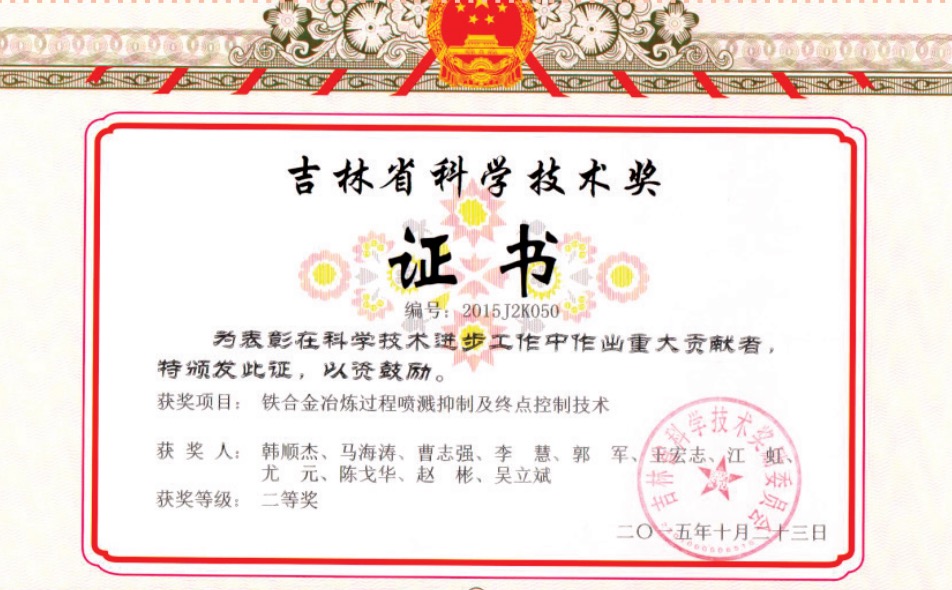 AOD 炉、转炉冶炼中低碳铬铁合金是铁合金生产的新工艺。该工艺与传统电硅热法工艺相比,具有流程短、能耗低、排渣量小等优点。该工艺在产业化过程中经常遇到喷溅严重、终点命中率低、炉衬耐火材料消耗高等问题。为了有效解决上述问题,项目组成员以 AOD 炉、转炉冶炼中低碳铬铁为具体研究对象,从喷溅产生的机理、终点参数的特征、炉衬蚀损的规律入手,采用小波包分析、多传感器信息融合、机器学习、推理控制、机器视觉、伺服驱动等技术手段,突破了技术瓶颈,最终形成在铁合金生产领域具有明显推广意义的安全生产、节能降耗研究成果。本系统可以成功地预测和抑制冶炼过程中喷溅的发生,预测成功率 99% ;碳值预测精度 ±1℃,冶炼时间小于 1h、终点识别准确率在 93% 以上。本系统能够准确地预测和控制终点温度和碳含量,缩短冶炼时间、提高产品质量,降低生产成本。研究成果对完善铁合金工艺,实现冶炼过程的安全生产、节能降耗提供了技术支撑,对促进铁合金行业的绿色转型、产业升级具有重要意义。研究成果已成功应用在中钢集团吉林铁合金股份有限公司 3 吨转炉和 5 吨AOD 炉冶炼中低碳铬铁冶炼过程中。已授权国家发明专利 4 件,累计创造经济效益 3085 万元,节支 298 万元,获得 2015年度获吉林省科技进步二等奖。