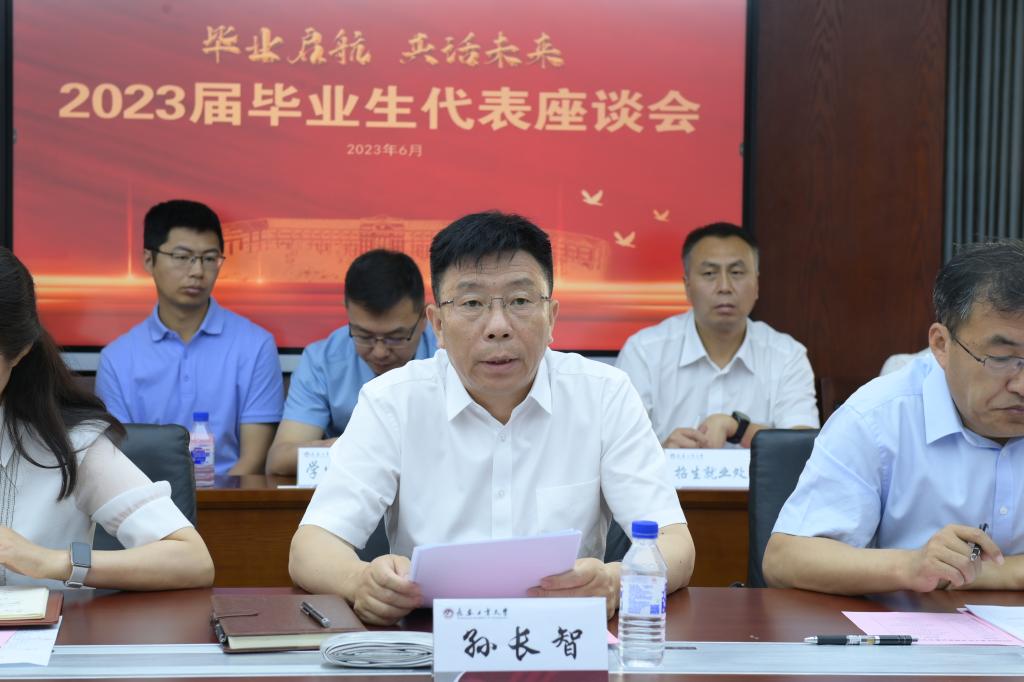 又是一年盛夏至,又是一年毕业时。6月19日上午,学校在南湖校区办公楼五楼会议室召开“毕业启航 共话未来”2023届毕业生代表座谈会,共叙师生情谊,共话学校发展。党委书记孙长智、校长张明耀、副校长金光勇、副校长郭世强出席座谈会。党委组织部、党委宣传部、学生工作部、研究生工作部、教务处、研究生院、招生就业处、后勤处、团委、校友工作办公室等部门负责人,各学院党委副书记以及来自15个学院的毕业生代表参加。座谈会由校党委副书记李东玲主持。