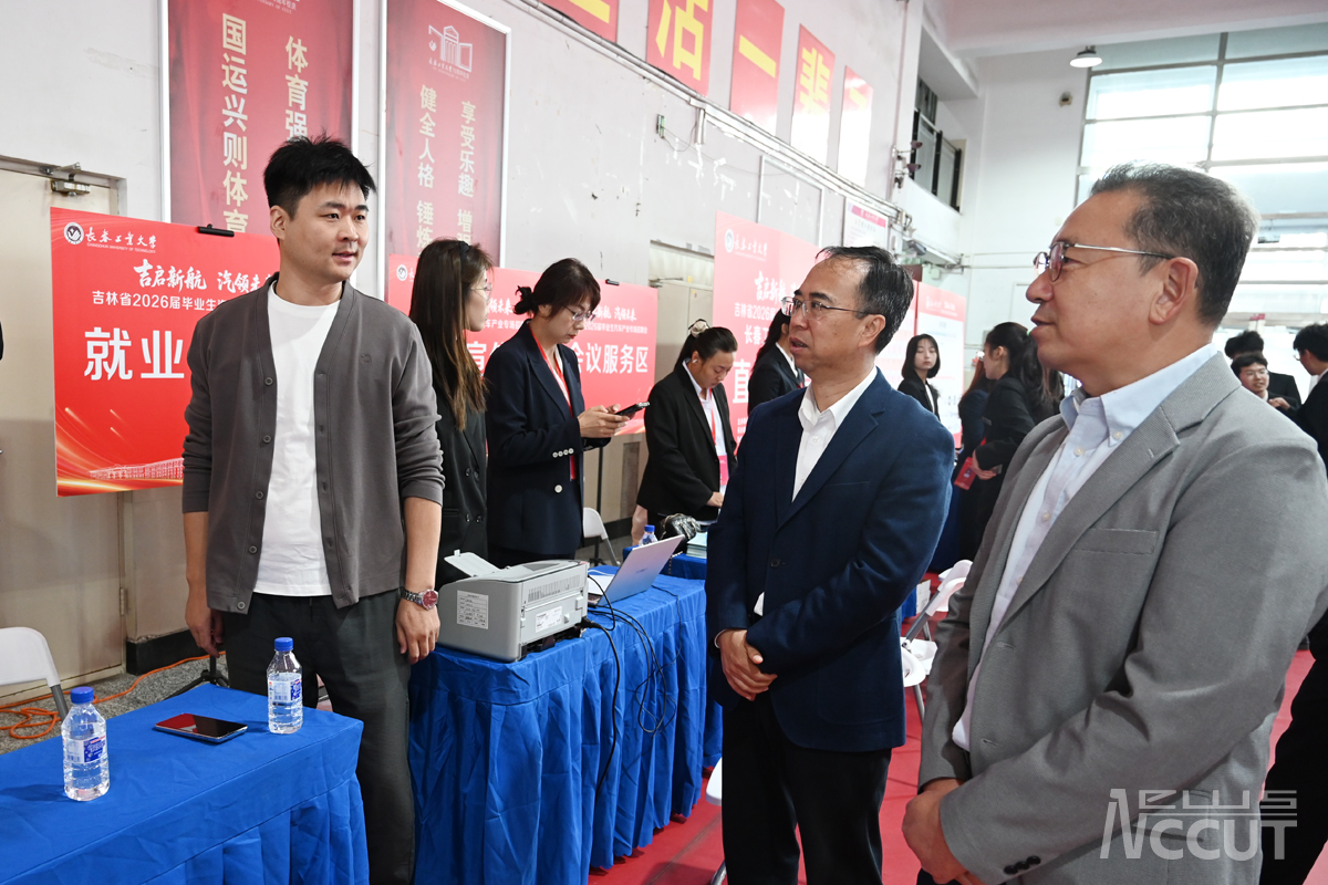 吉林省教育厅二级巡视员包国庆、学生处处长宁宝忠,吉林省高等学校毕业生就业指导中心主任申守权,吉林省高校服务新型工业化产业就业联盟成员高校有关领导出席活动。副校长胡刃锋热情接待了出席活动的各位领导并一同参加活动。学校相关部门负责人、部分学院党委书记、各学院党委副书记、毕业班辅导员深入现场了解市场需求。2026届毕业生参加招聘会。